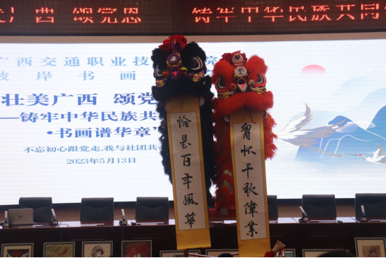 开幕式上,总支副书记、通识教学部梁东颖主任致辞:“彼岸书画协会成立于2003年,至今二十载,风华正茂。我们广大青年在日常学习和工作中应坚持以党的二十大精神为指引,对照习近平总书记对广西“五个更大”重要要求,深入贯彻落实习近平总书记视察广西“4·27”重要讲话和对广西系列重要指示精神,以新时代壮美广西建设为中华民族伟大复兴添砖加瓦。”开幕式后邀请了我校龙狮协会现场表演;助兴演出后,现场嘉宾浏览书画、篆刻精品并进行现场笔会。