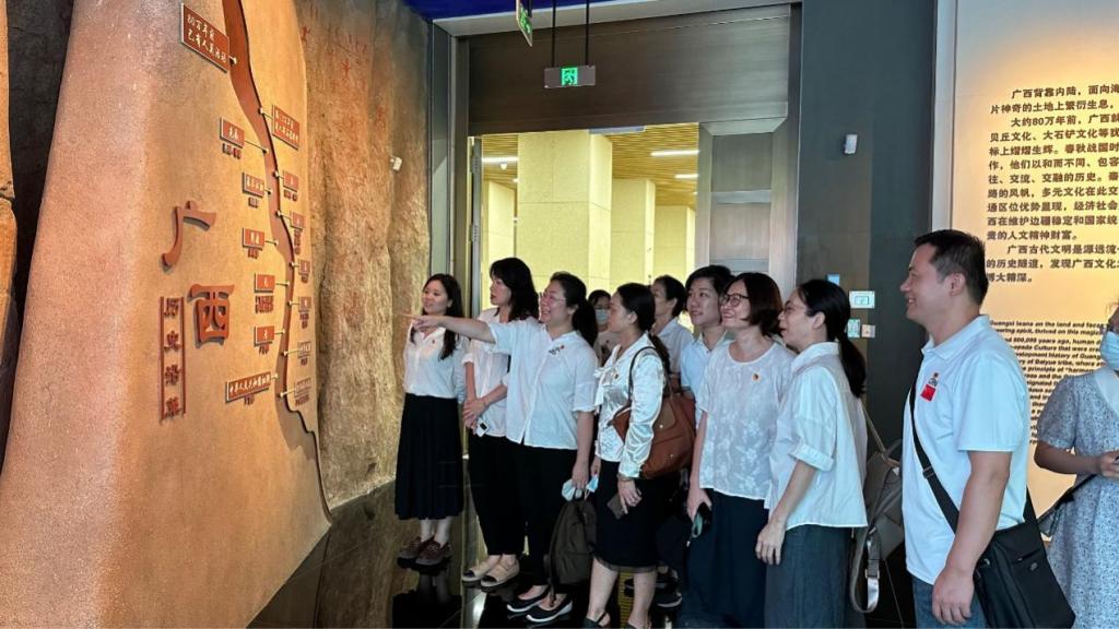 全体人员集中参观了“合浦启航——广西汉代海上丝绸之路”、“广西古代文明陈列”两个主题展馆。在合浦启航——广西汉代海上丝绸之路展馆,党员们了解到广西在古代海上丝绸之路发展中的独特历史地位,学习了“和平合作、开放包容、互学互鉴、互利共赢”的核心丝路精神。广西古代文明陈列展馆,富有浓郁地方特色的岩画、铜鼓、灵渠、岩洞葬等珍贵文物,展示了波澜壮阔、辉煌灿烂的广西古代历史发展进程和成就。