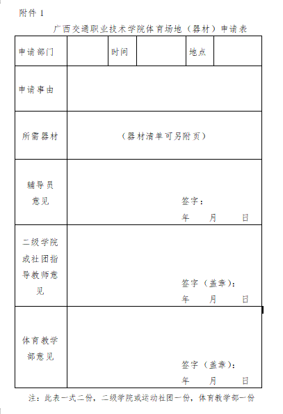 各二级学院、运动社团组织各类体育赛事,或者班级特色活动,需提前三天向体育教学部健康与竞训教研室递交场地及器材使用申请书,申请书需写明所用场地、用途、举办的时间和地点、参与活动的班级和社团以及所需体育设备和器材,明确场地器材借用负责人,经体育教学部同意并核签后方可使用场地及体育器材。