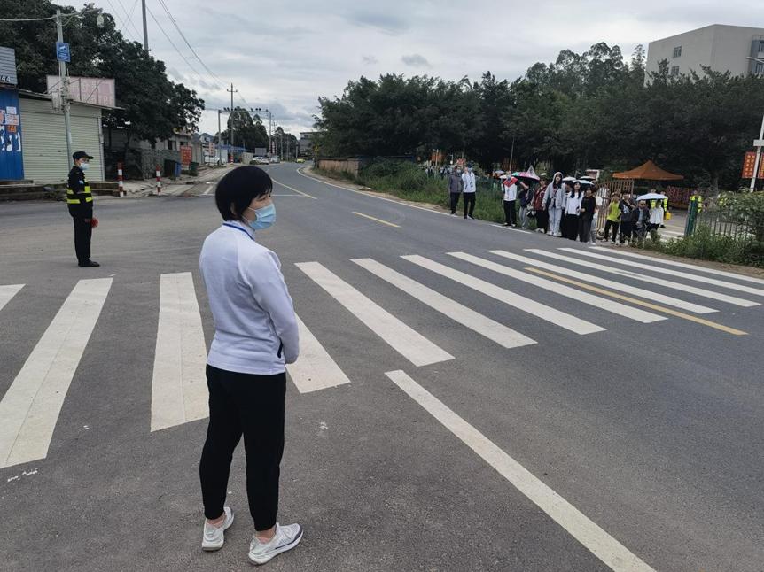 因昆仑校区西区田径场位于校区围墙外,且中间隔着南宁市兴宁区029县道,为防止授课学生随意接触周边商贩或到无证摊点就餐,加大学生行为的约束管理力度,提高学校疫情防控的执行力。体育教学部从4月1日起,每天派专职老师在侧门接、送上课学生。党员教师们身先士卒,主动担当,发挥了党员不怕吃苦、细致入微的带头作用,赵海燕根据集合慢、过马路时间长、安全性差等现实情况,制定了领路排班表,使上课学生不必集中通过,时间更自由,也减轻了029县道的交通堵塞压力;下雨了,莫沉和程昭云在雨中不忘安全,努力疏导学生队伍、在斑马线一左一右当起了交通指挥员,直至最后一名上课的同学安全通过才收队返回课堂,集合点名。