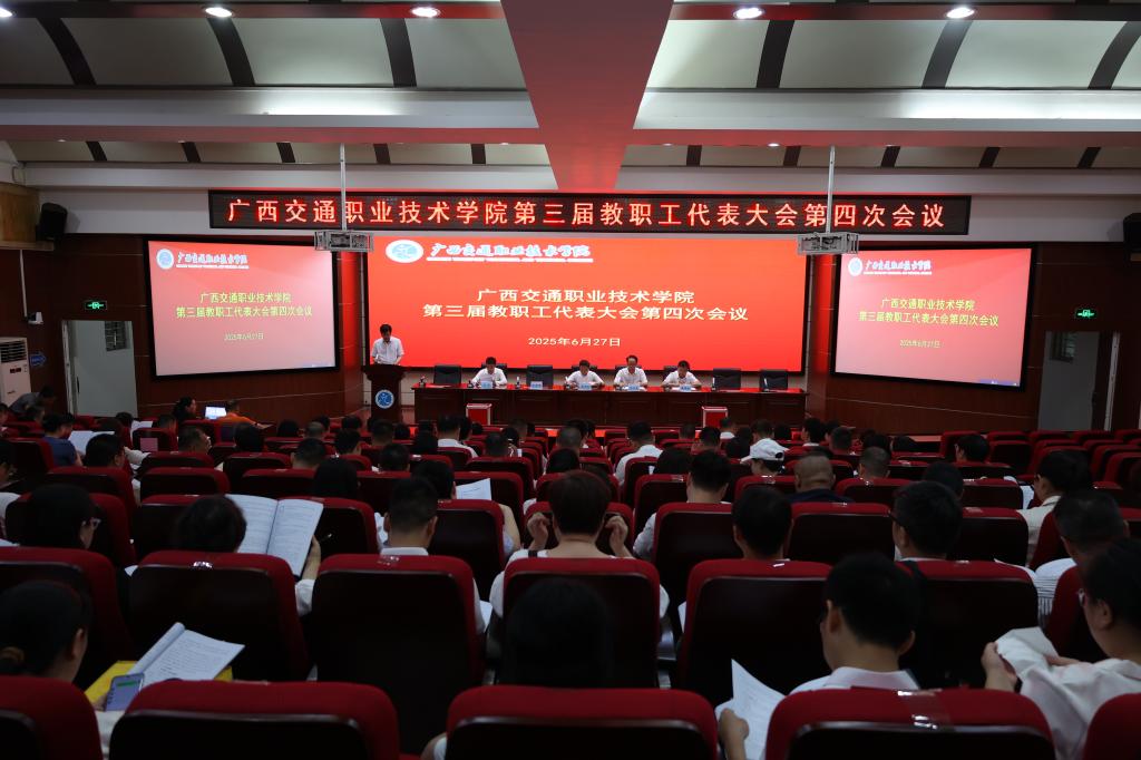 (工会 讯 龚春鸣/文)6月27日上午,学校第三届四次教代会暨第二次工代会在昆仑校区第一学术报告厅召开。学校党委书记陈湘如,校长李文勇,副校长戴晓云、邱实与来自学校各单位、各部门共150余名正式代表、列席代表齐聚一堂,共谋学校发展大计。学校党委副书记陈海峰主持会议。教代会现场教代会上,人事处就《广西交通职业技术学院岗位竞聘工作方案》(2025年修订草案)目标任务、岗位设置、目标与职责、聘期考核等方面进行了说...