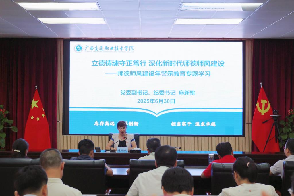 (教师工作部、纪检监察室 讯 王新、段金华/文)6月30日,广西交通职业技术学院在昆仑校区管理楼五楼会议室召开师德师风警示教育专题学习会,各教学单位、行政部门共同参与。学习会现场会上集中观看了警示教育片,学校党委副书记、纪委书记麻新桃引经据典、以案明纪,以古为鉴阐述师德内核,结合近年高校教师学术不端、违反职业行为准则等典型案例,深入剖析当前师德师风建设面临的新挑战。她强调,高校教师不仅要以历史先贤为...