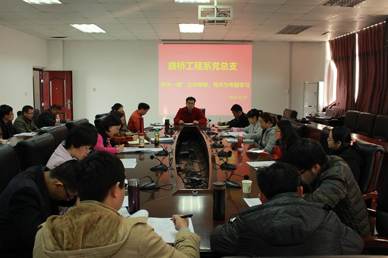 (路桥工程系讯 刘振华、杨静/文 杨静/图)12月27日,路桥工程系党总支开展“讲奉献、有作为”专题学习,学院陈海峰副院长与路桥工程系领导班子、全体党员参加专题学习会。 会上,系...