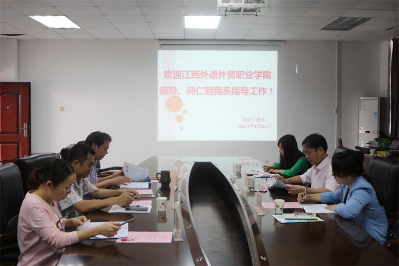 (路桥工程系讯 杨静/文、图)近日,江西外语外贸职业学院电子商务学院院长宋俊骥一行三人到我院路桥工程系进行座谈交流,双方就现代学徒制的人才培养模式、校企合作、学生就业等问题进行深入探讨。 座谈会上,路...