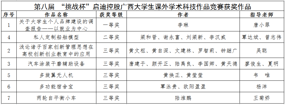 (学生工作处、团委 讯 张 佺、盘慧凤 /文) 近期,由共青团广西区委、自治区教育厅、自治区科技厅、自治区科协、广西学生联合会联合举办的第八届“挑战杯”启迪控股广西大学生课外学术科技作品竞赛落下...