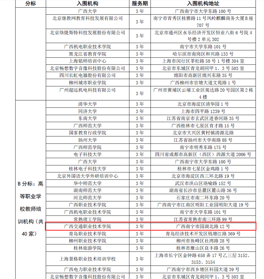 (教务处 讯 张立玮、陈均康/文)近日,2017-2019年广西职业院校教师培训项目定点培训机构招标中标结果公布,我院成功入围2017-2019年广西中等职业学校教师培训项目定点培训机构和2017-2019年广西高等职业学校...