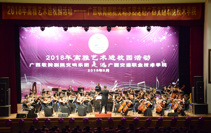 (学生工作处 团委 讯 张 佺、盘慧凤/文) 5月14日晚,由自治区教育厅主办的“2018年高雅艺术进校园活动——广西歌舞剧院交响乐团走进广西交通职业技术学院”在园湖校区大礼堂精彩呈现。高雅...