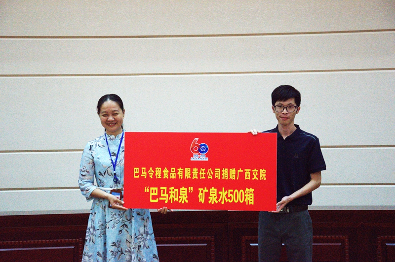 (校庆办 讯) 学院60周年校庆筹备工作得到了广大校友的大力支持, 6月19日,交通信息工程系2011级优秀校友石阳成代表广西巴马令程有限责任公司向学院捐赠“巴马和泉”500箱。 在建校60周年校...