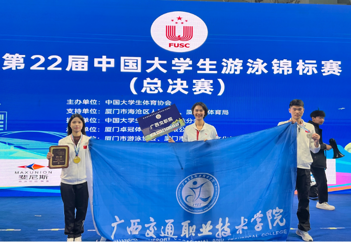 (体育教学部 讯 谢凡/文)第22届中国大学生游泳锦标赛12月3日-6日在厦门海沧体育中心游泳馆举行。学校体育教学部许静林老师带队,园林2021-1班李怡 ,航海技术2021-1班文庆涛两名学生为代表组成学校游泳队参加了女子乙组100米蝶泳及男子乙组100米蛙泳、200米混合泳共3个项目。其中李怡同学在女子乙组100米蝶泳中夺得该项目的全国金牌,并打破赛会记录,成为全广西高职院校女子蝶泳项目的首枚国赛金牌获得者。比赛现场在12月4日...