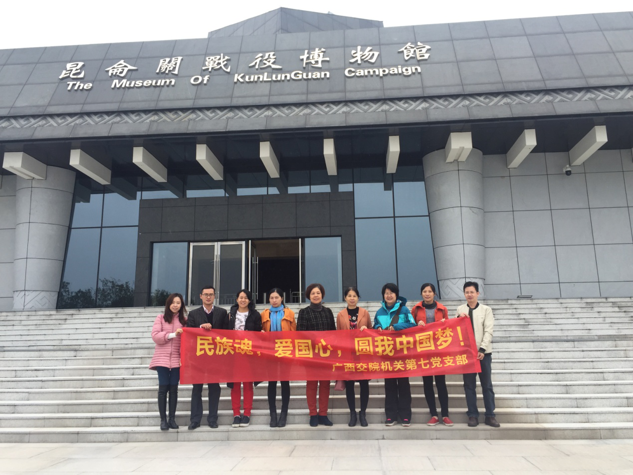 (机关第七党支部 讯)11月24日,机关第七党支部全体党员和入党积极分子一同前往昆仑关战役博物馆开展题为“民族魂,爱国心,圆我中国梦”的爱国主义教育活动。 在博物馆讲解员的引领下,支部全体党员重温了...