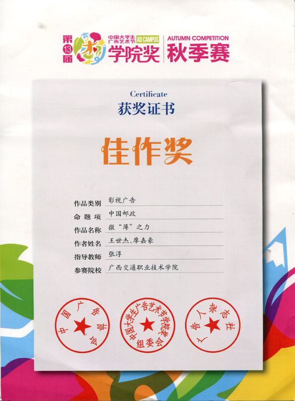 (信息工程系 讯 李燕妮/文)由国家工商行政管理总局批准、中国广告协会主办、广告人杂志社承办的全国高校大型活动——第13届大学生广告艺术节学院奖秋季赛已落下帷幕。我院信息工程系多...