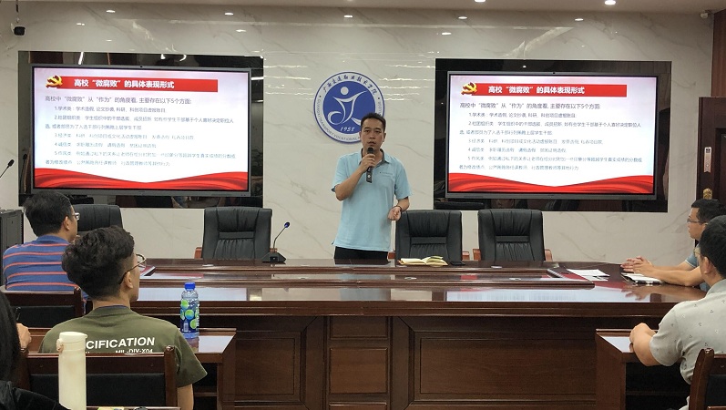 (交通信息工程系 讯 周玉霞、韦唯/文、孙坚/图)为强化教师廉洁从教意识,筑牢拒腐防变的思想道德防线,2020年7月21日,交通信息工程系党总支在707会议室开展“坚守廉洁心,杜绝校园微腐败”专题党课学习。本次党课由系党总支书记杨顺韬同志主讲,系部全体教师参加学习。
