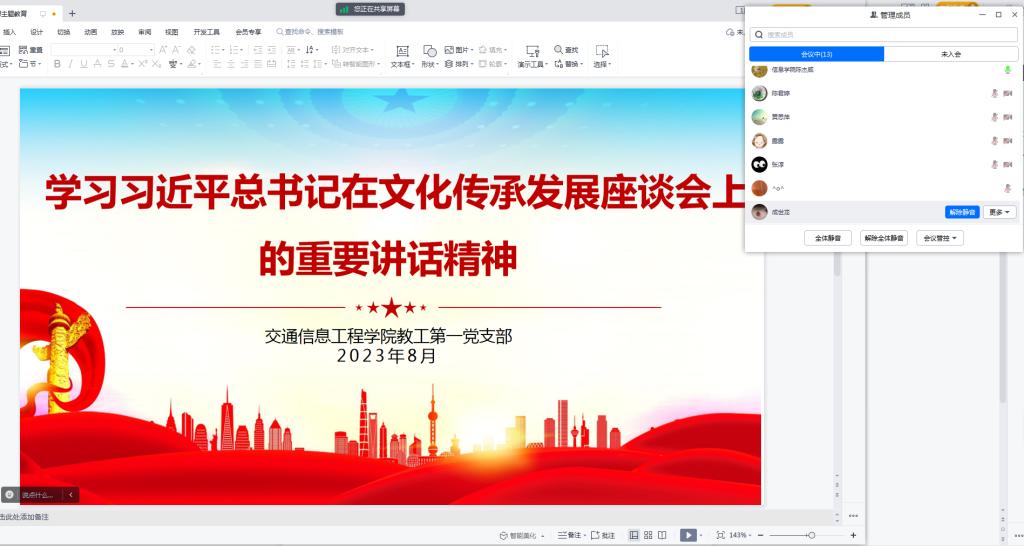 (交通信息工程学院 讯 梁红艳/文、图)2023年8月8日,交通信息工程学院教工第一党支部开展线上学习专题会,深入学习习近平总书记在文化传承发展座谈会上的重要讲话精神。会议由支部组织委员陈杰威同志主持,支部教师参加会议。