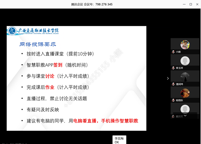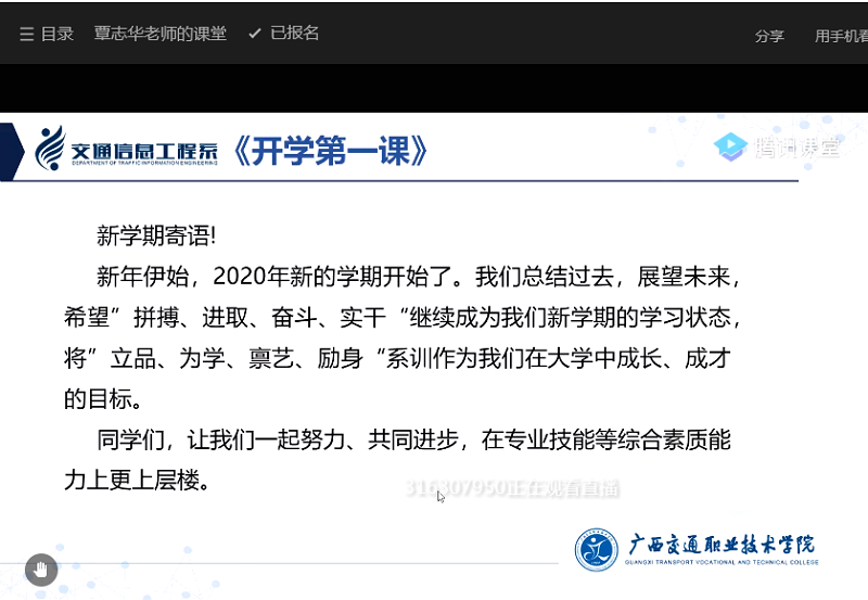 (交通信息工程系 讯 孙坚、阮兰娟/文)3月2日,根据学院下发的《关于做好2020年春季学期开学前后有关工作的通知》精神,交通信息工程系的老师们通过“智慧职教 腾讯课堂”、“智慧职教 腾讯会议”等多种平台组合开展了线上正式教学的第一堂课。线上开课第一天,有6位老师,12个班级,500多名学生共聚“线上第一课”。