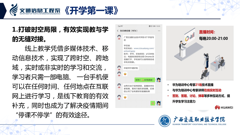 战“疫”关头“停课不停学”既是责任,也是使命,交通信息工程系将继续坚持做好疫情防控期间线上教学督导和保障工作,切实做到停课不停学、延期不延教。