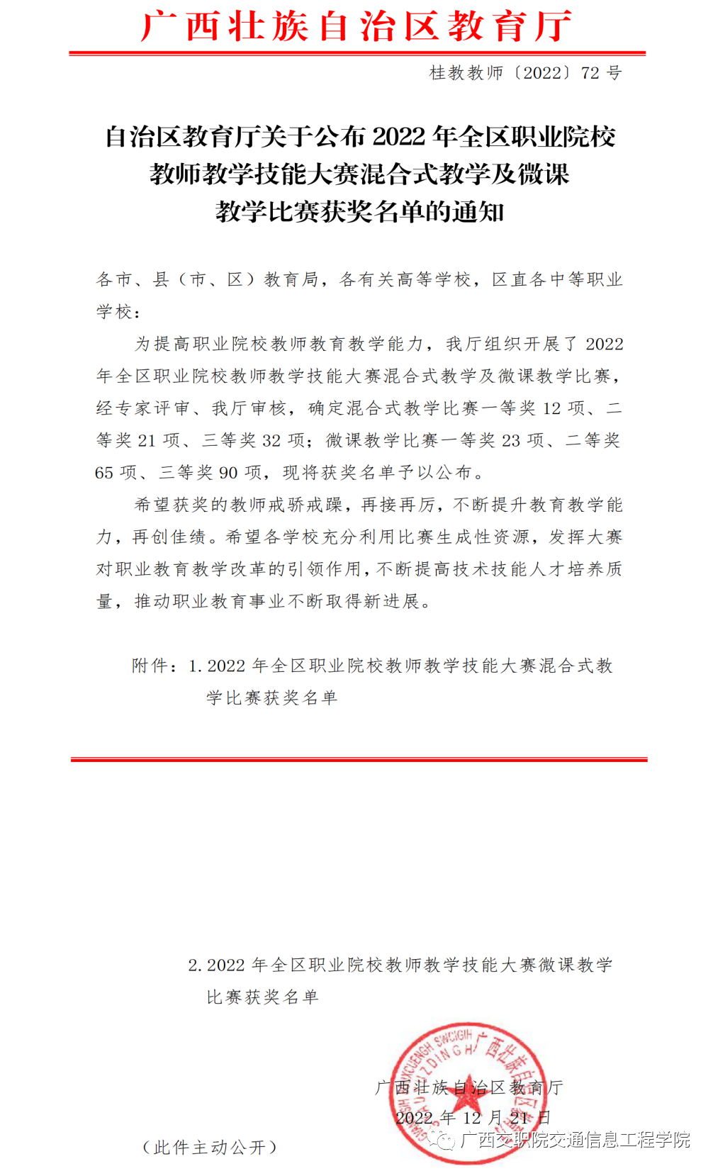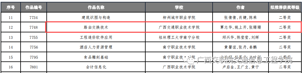 (来源:交通信息工程学院 文/张珊珊、陆海鹏 图/覃志华、周显琳)近日,广西壮族自治区教育厅发布《关于公布2022年全区职业院校教师教学技能大赛混合式教学及微课教学比赛获奖名单的通知》,我院计算机网络技术专业参赛作品《路由交换技术》荣获高职组混合式教学比赛二等奖,实现了我院在该赛项上的首次突破。