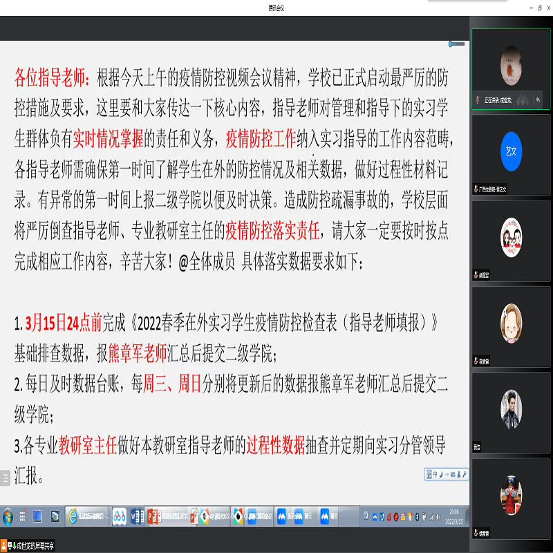 (交通信息工程学院 讯 熊章军/文、覃艺文/图)3月15日晚,交通信息工程学院根据学校的疫情防控视频会议精神召开2022届实习指导老师线上工作会议,部署相关工作任务,落细落实疫情防控举措。会议由成世龙副院长主持,...