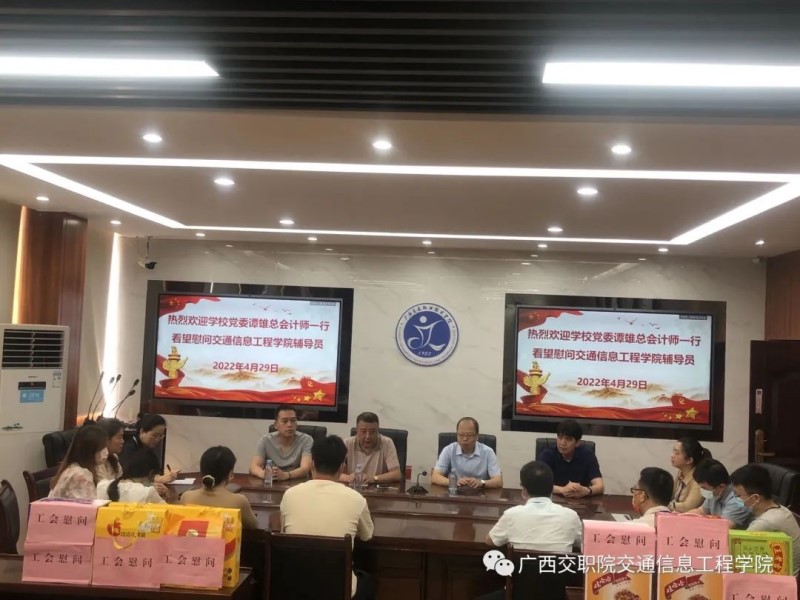 (交通信息工程学院 讯 周玉霞/文、孙坚/图)4月29日上午,学校党委谭雄总会计师、工会副主席黎明一行莅临我院看望慰问疫情期间奋斗在一线的学工队伍并送上慰问品。图1:会议现场谭雄总会计师与辅导员、班...