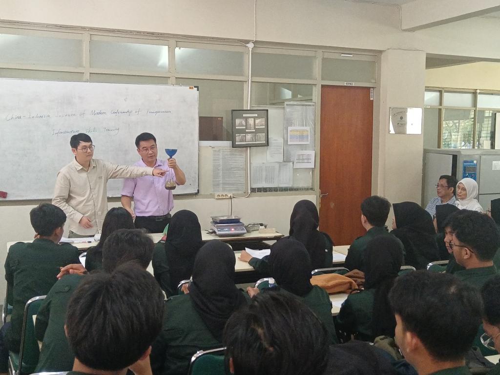 在印尼国立技术大学举办了仪器操作培训班,学校李克元、周学翔两位老师为同学们开展了回弹仪、马歇尔电动击实仪等仪器的操作培训演示,为培训班进行了《细集料表观密度》实训课程的理论授课和实操演示,课堂融合知识、技能理实一体,互动氛围良好,得到印尼教师、学生的一致肯定。