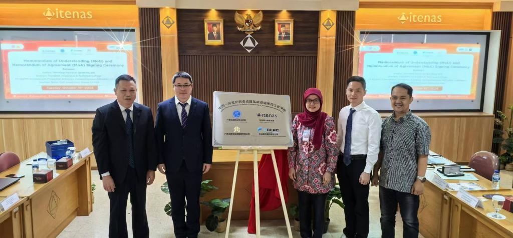 学校副校长陈正振与印尼国立技术大学校长Mleilinda Nurbanasari、中国五矿集团中冶南方都市环保印尼公司人力部总经理余剑英、广西北部湾投资集团有限公司副总经理冯春萌,共同签署了四方合作协议书,共同为中国-印度尼西亚交通基础设施现代工匠学院揭牌。合作四方将以现代工匠学院为平台,做好教学资源开发、课程共建、专业衔接、实习实践等,共建专业标准、课程标准和教学资源,发挥技术技能培训、人才培养、文化交流等方面的作用,推进职教出海、校企同行。