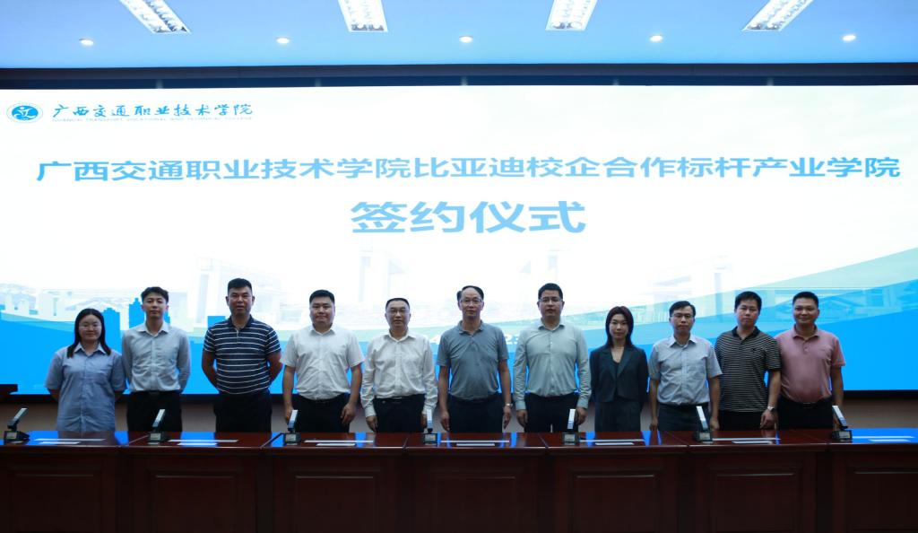 随后,广西交通职业技术学院、比亚迪股份有限公司、深圳风向标产教融科技有限公司共同签署了比亚迪标杆产业学院协议。三方约定,共同强化资源建设,共同深化产教融合、科教融汇。