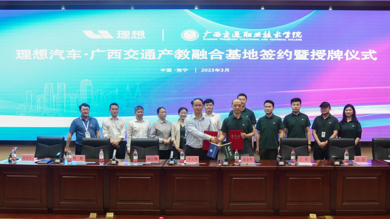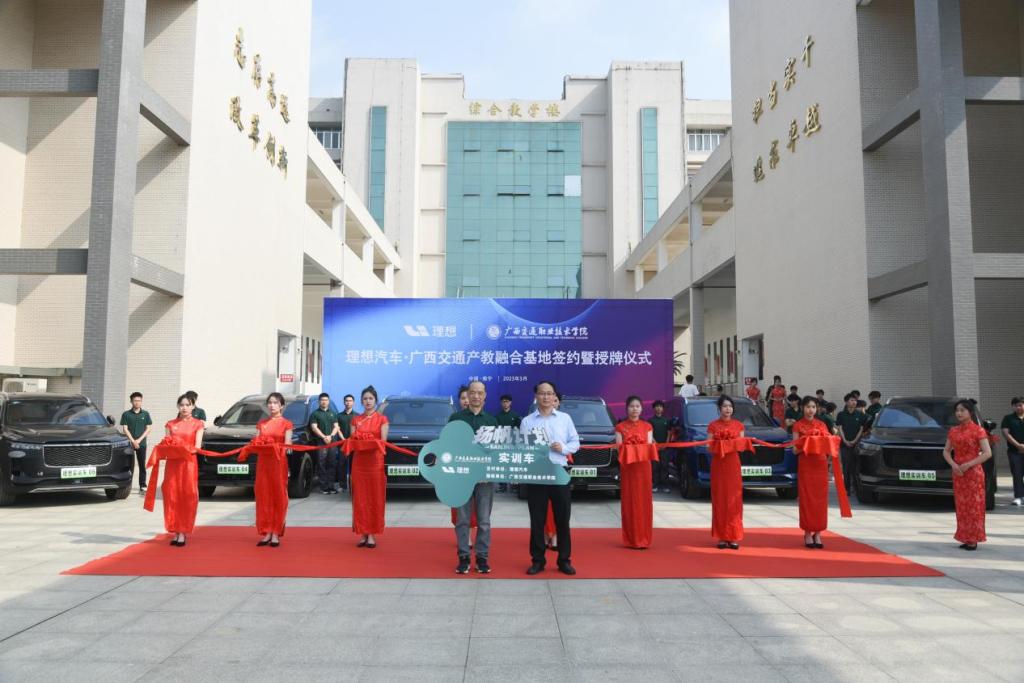 在现场领导与嘉宾的见证下,李文勇校长与理想汽车售后网络运营负责人翟韶辉现场签订了“扬帆计划”校企合作协议。理想汽车交付8辆理想ONE汽车和设备用于实训教学,校企双方为理想汽车·广西交通产教融合基地揭牌,并给项目团队颁发“双师”证书。