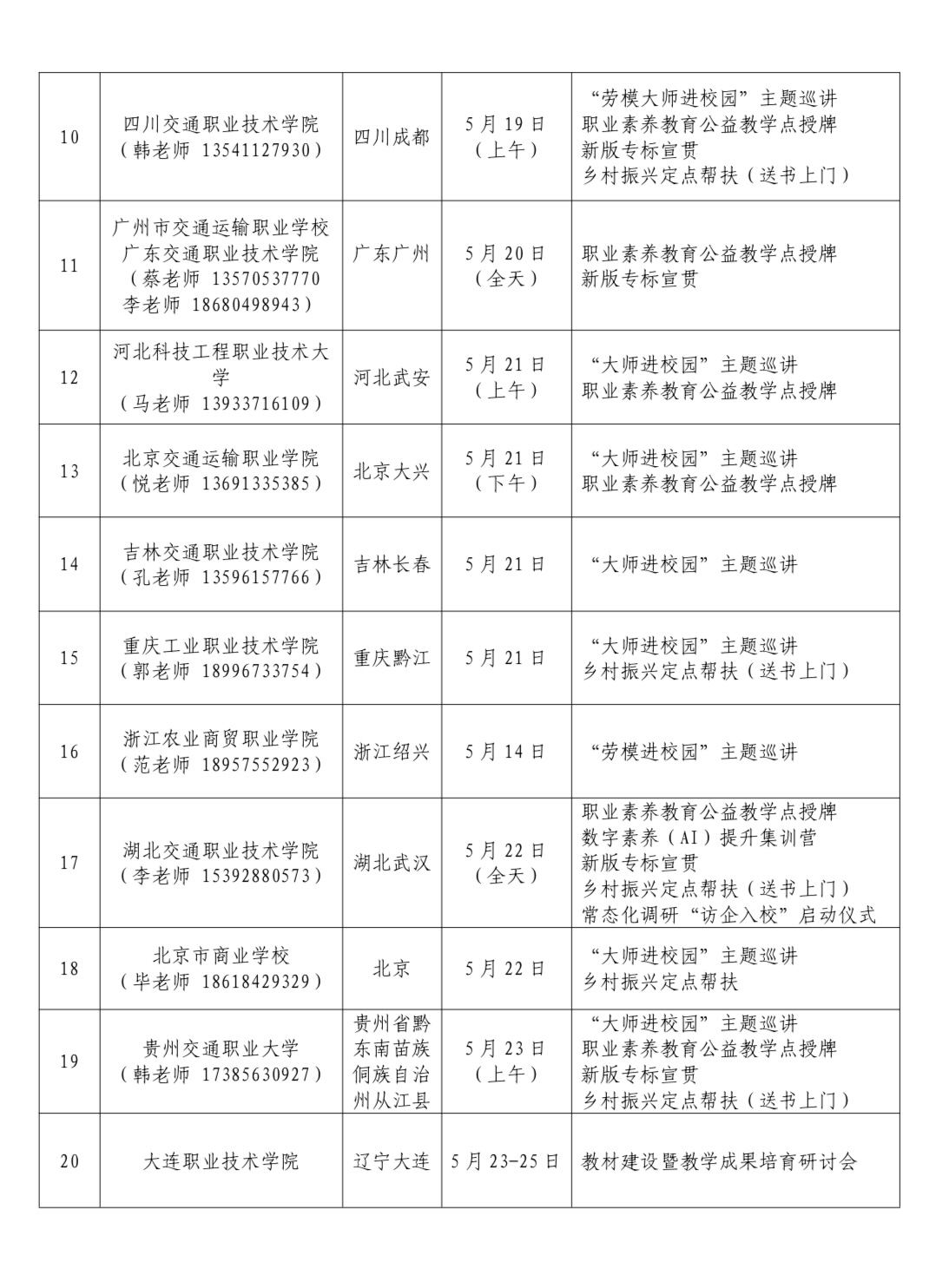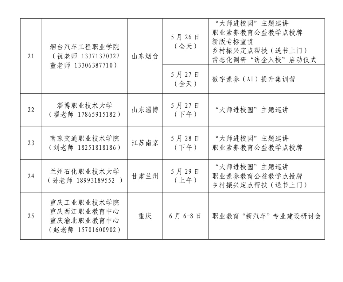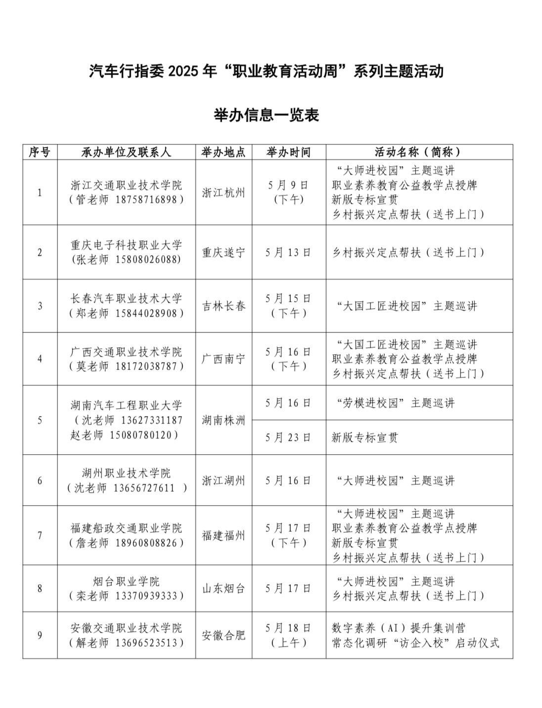 此外,汽车行指委2025年“职业教育活动周”系列主题活动还将在成都、广州、武安、绍兴、武汉、北京大兴、北京昌平、无锡、从江、黔东南苗族侗族自治州、烟台、淄博、南京、长春、大连、兰州、重庆等十八个地区陆续开展。大国工匠、劳模等先进典型人物的巡讲、乡村振兴定点帮扶、“访企入校”调研、汽车专业教师数字素养(AI)提升集训营、“百城千校”汽车专业教学标准宣贯、“职业素养教育进院校工程”公益教学点集中授牌仪式、职业教育“新汽车”专业建设研讨会等,更多紧密结合汽车产业的最新技术发展趋势,凸显职业教育特色的专项活动还将陆续开展,敬请期待!