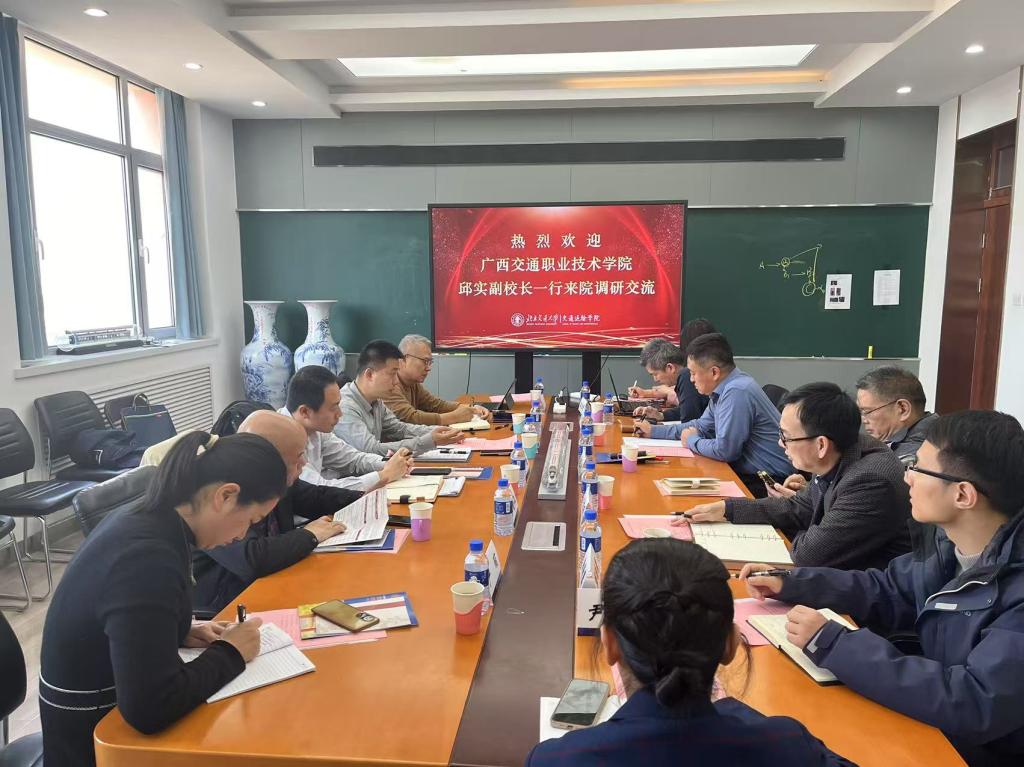 在北京交通大学交流座谈会上,邱实副校长介绍了学校的在进国家双高、创职业本科过程中取得的成绩,希望从对外合作、继续教育、科研与社会服务方面与北京交通大学有进一步合作,共同服务西部陆海新通道、平陆运河建设,助力广西交通运输事业发展。