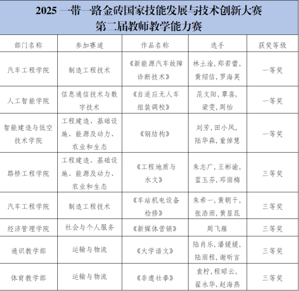 (教师发展中心 讯 邓维宇/文)近日,在2025一带一路暨金砖国家技能发展与技术创新大赛之第二届教师教学能力赛国内选拔赛中,我校派出的9支教师队伍斩获8个奖项,获奖总数列全国第二,获一等奖总数列全国第一。