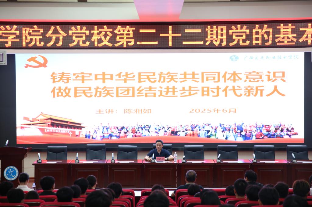 近日,广西交通职业技术学院党委书记陈湘如在昆仑校区第一学术报告厅以“铸牢中华民族共同体意识,争做民族团结进步时代新人”为题讲授专题党课,汽车工程学院领导班子、师生代表共150余人聆听了党课。